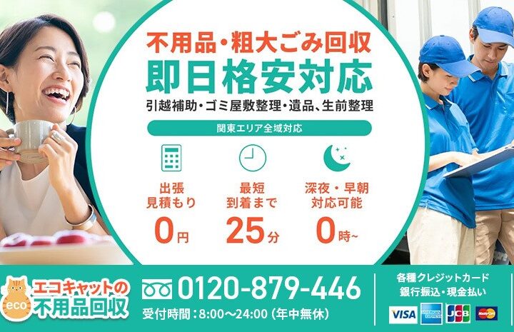 エコキャットは、不用品や粗大ゴミの片付けをはじめ、遺品整理やゴミ屋敷の清掃まで幅広く対応する片付け専門サービスです。東京都、神奈川県、埼玉県、千葉県をカバーし、最短25分で現場に急行できる迅速さが強みです。出張費や見積もりはすべて無料で、見積もり後のキャンセルも可能なため、初めての方でも気軽に利用できます。