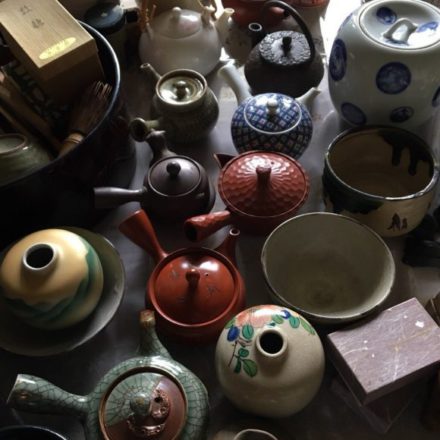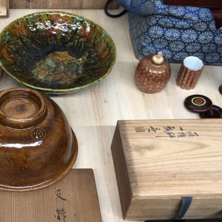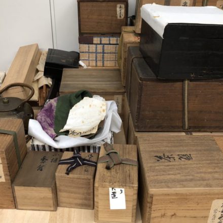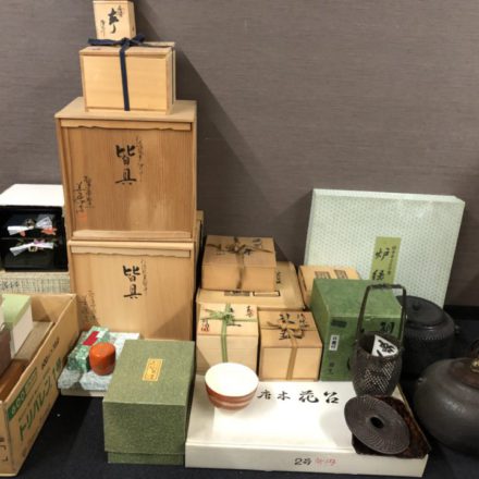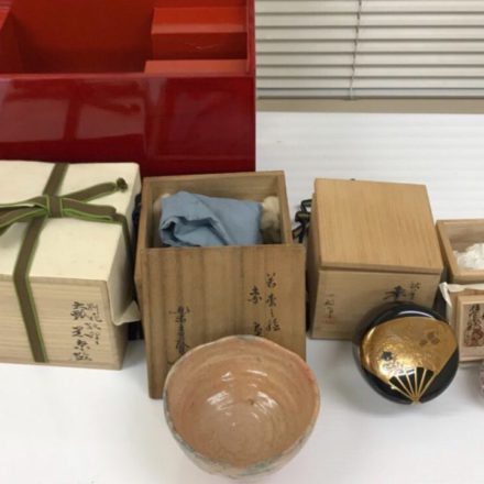 叔母様が生前お茶とお花と書道の先生をされていて、遺品整理を姪っ子様に任され、その姪っ子様から買取依頼をいただきました。それぞれの道具は良いものが多く大樋長左衛門、永楽善五郎、漆器の一瓢齊他に桐箪笥、端…