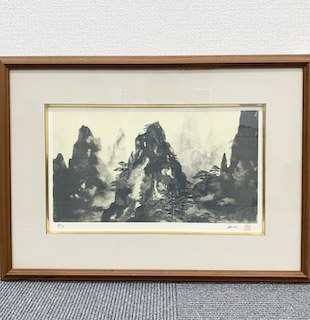 今回査定させていただいた作品中、平川敏夫の70部限定の版画をお買取させていただきました。この作品は中国の山水を取り入れ、描いた水墨の画です。平川敏夫の水墨画がとても高い評価を受けています。シミ、ヤケなどなく、保存状態は良好であったため、高価にて買取させていただきました。
