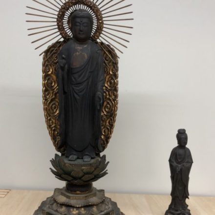 家にある美術品を整理したいため、出張査定のご依頼をいただきました。今回買取させていただましたお品物の中には大型の時代鎌倉彫天狗面がありました。高さは約50㎝があり、非常に迫力ある彫刻で生き生きと表現されます。具体的な製作年代は不詳ですが、おそらく明治後期から大正時代の作品だと思われます。全体的に大きなダメージはない綺麗な状態でしたので高価にて買取させていただきました。他にも掛軸や陶磁器などを譲っていただきました。ありがとうございました。